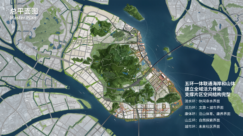 滨水环构建贯通亲海体验,活力环创新滨水休闲场景,城市环塑造青年友好生活方式,康体环整合全域健康生活网络,山丘环打造近山探索与自然连接的体验系统,由此,南沙湾山、海、城交融的空间秩序得以完整。