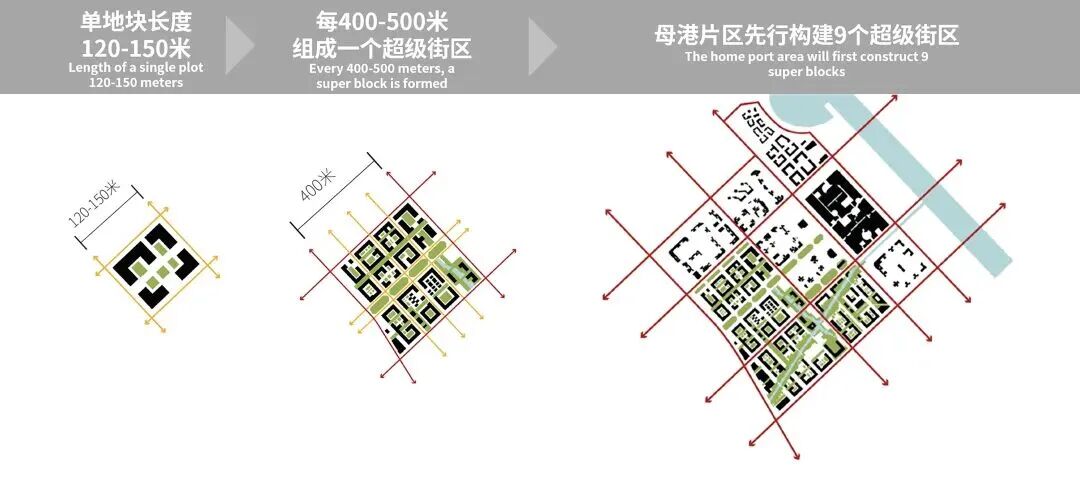 借鉴巴塞罗那经验,在生活外环之上,通山达海,覆盖全域的3分钟绿色网络,构建实现目的地之间的高效舒适连接。重构街区尺度,以100米见方的“超级街区”实现“车本位”到“人本位”的空间转型。