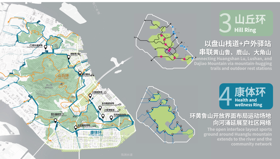 * 山丘环+康体环:半山户外设施体系+融入日常的自然运动空间
