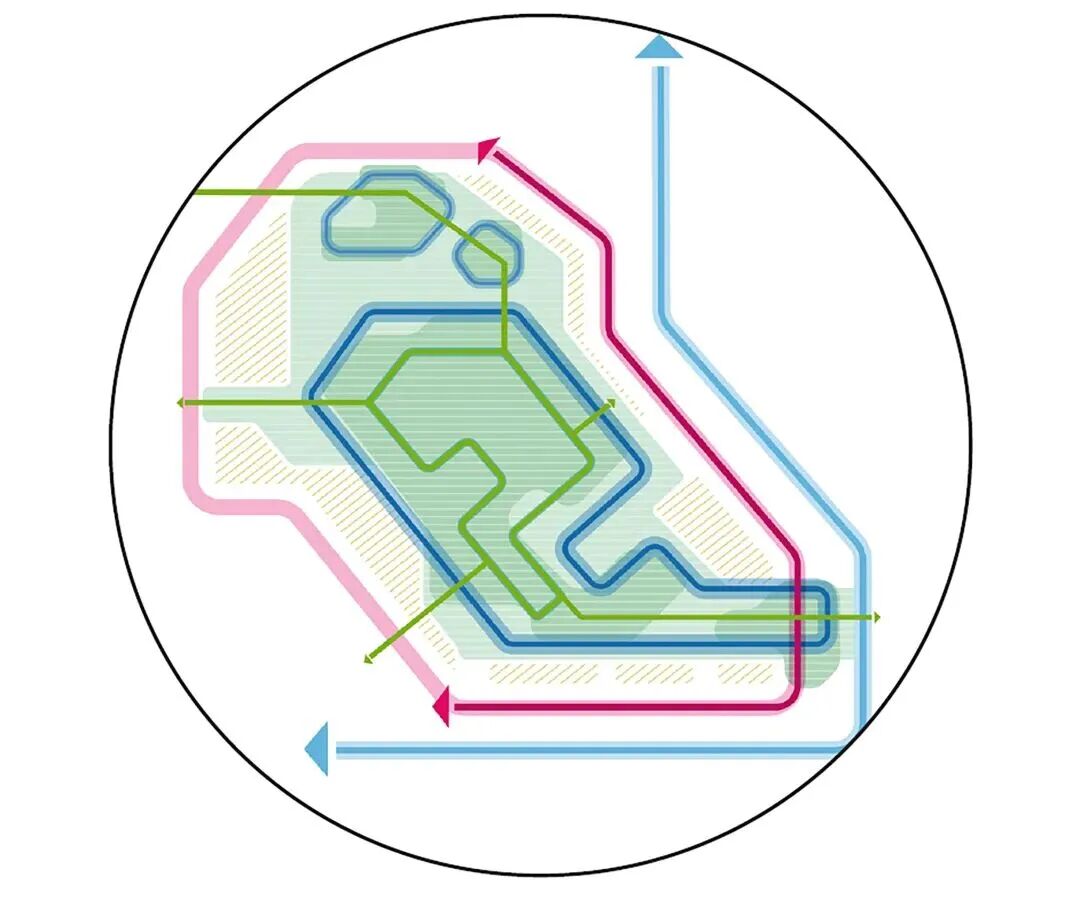在中观片区层面,我们针对港前大道割裂城市功能的问题,建立环黄山鲁内外双环系统,优化交通体系。效率内环-蒲州大道高效分流;生活外环-港前大道链接滨海、站点和生活目的地。将港前大道绿化带拓宽成为20米宽的游憩公园道,承载活力场景。
