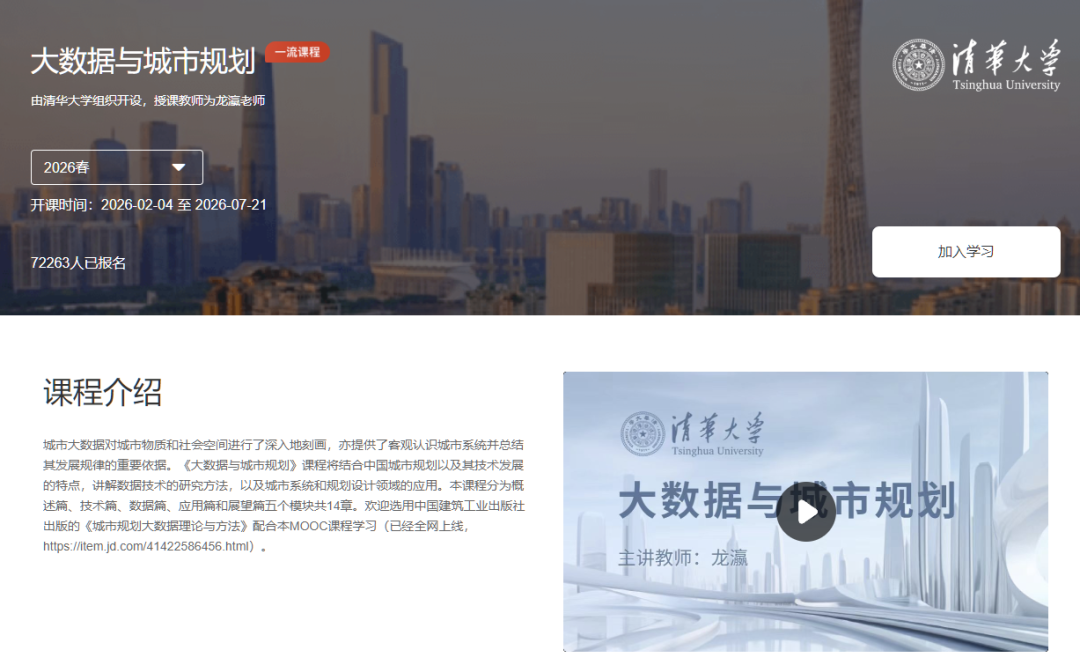 在迎接了7万学员后,首批国家级一流线上课程《大数据与城市规划》MOOC 2026春季学期开课啦, 持续开放选课中!