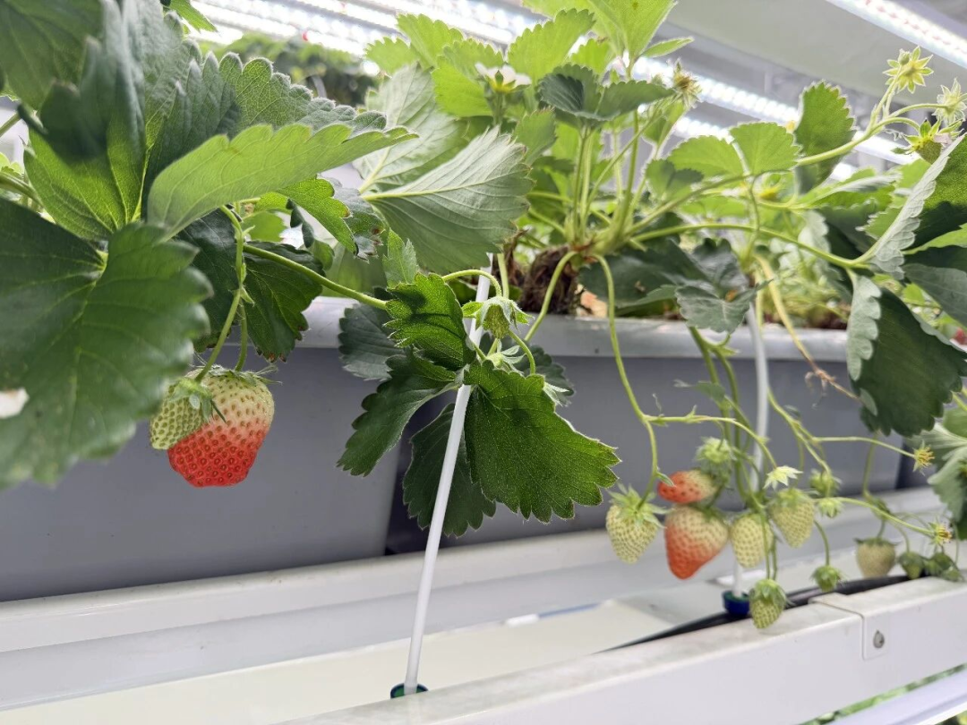 白鹤数智草莓植物工厂引入8层6列高密度固定种植架与轨道车系统,草莓的生长空间向高空垂直延伸,加上全年稳定的环控系统,草莓可连续采收10个月以上,单株月产果量稳定在100克左右,全年单株产量在1.2至1.3公斤,较传统地栽产量提升近30倍。