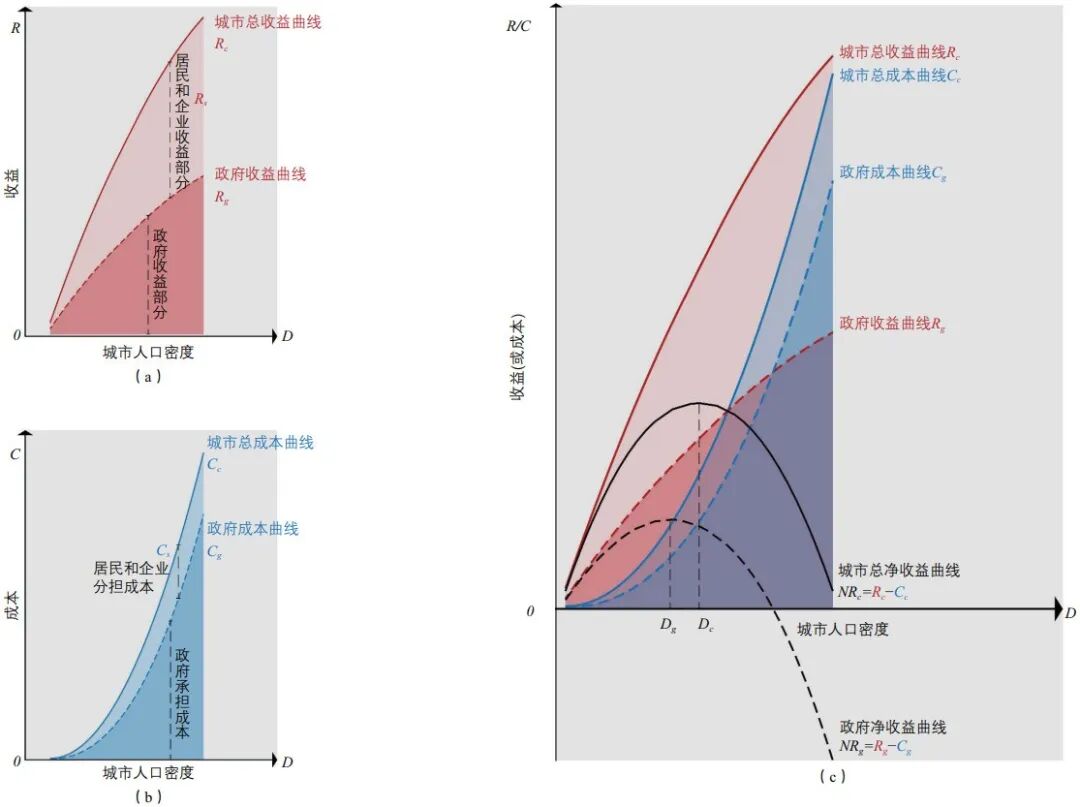 在现行的中国城市管理体制之下,地方政府与居民、企业等社会主体之间的“成本—收益”分担和共享机制表现为非对等特征,在一定程度上扭曲了各个城市的人口密度管控政策。一方面,在城市密度的收益分配中,居民和企业方往往得到了更直接的密度收益(如生产效率和薪酬增加、便捷的公共服务、更多样化的商品和服务选择、不动产的价值上升等),而城市政府的正收益更多是经济加速运转带来的部分间接受益(如在商品经济消费循环中获得税收),表现为密度收益中的个人和企业部分大于等于政府部分(图4a中,RsRg)。另一方面,在城市密度的成本分担中,交通拥堵、环境污染、应急管理(特别是一些突发事件)等的治理责任更多地给地方政府带来拥挤成本压力,但个体和企业可能只承担了其中一小部分(图4b中,CsCg)。因此,这种“收益—成本”的非对称现象往往导致政府净收益曲线的最优密度小于城市总净收益曲线的最优密度(图4c中,DgDc),导致城市政府产生超前疏解的政策冲动(同样地,个体和企业往往会向城市过度集聚),损害了城市的密度净收益福利。