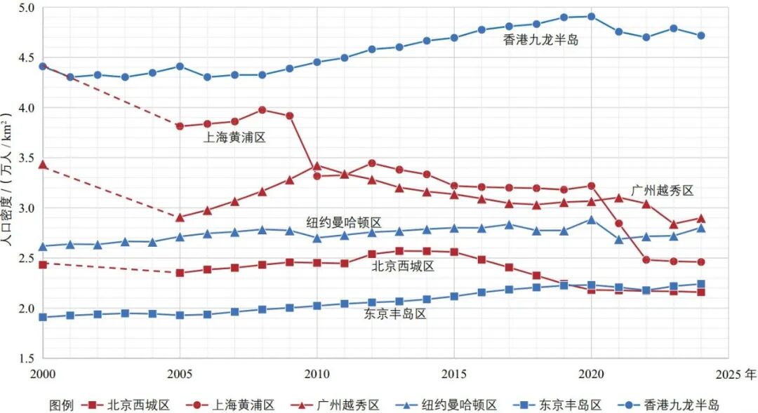 注:因涉及行政区划调整,上海黄浦区在2011年之前数据由原黄浦区和原卢湾区合并计算,北京西城区在2010年之前数据由原西城区和原宣武区合并计算,广州越秀区的2000年数据为原越秀区和原东山区合并估算。北京西城区和上海黄浦区的2000年常住人口数据来自第六次人口普查数据,20012004年常住人口数据缺失,20052022年常住人口数据来自《北京统计年鉴》和《上海统计年鉴》,20232024年常住人口数据来自西城区和黄浦区的《国民经济和社会发展统计公报》。纽约曼哈顿人口数据来自纽约州政府网站,东京丰岛区人口密度数据来自丰岛区区役所官方网站。因香港岛缺少历年的建设用地面积数据,本研究选取香港九龙半岛(包括油尖旺区、深水埗区、九龙城区、黄大仙区和观塘区)作为其核心城区,以其全域面积作为建设用地估算人口密度,相关数据来自历年《香港年报》。