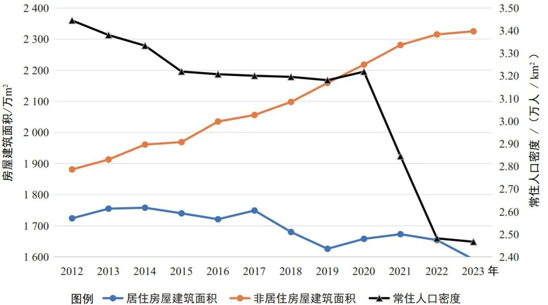 5  上海黄浦区的居住和非居住房屋存量面积及人口密度变化(2012—2023年)