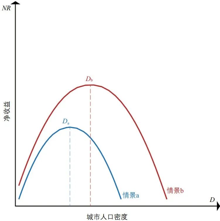 然而,城市密度效益的倒U曲线和最优密度值并非一成不变,而是会随着基础设施技术水平进步和精细化管理能力提升而持续演进迭代。在城镇化的早期阶段(图3情景a),由于基础设施服务水平有限、精细化管理措施不足,密度增加将快速增加拥挤效应,导致城市密度效益拐点(最优密度Da)较早出现;随着体力城镇化转向智力城镇化(情景b),地铁等大运量交通设施的普及应用将有效缓解高密度人居环境的出行压力,移动互联网技术也将切实提升城市精细化治理的整体水平,进而缓解拥挤效应,提高城市的最优密度值(Db>Da)。