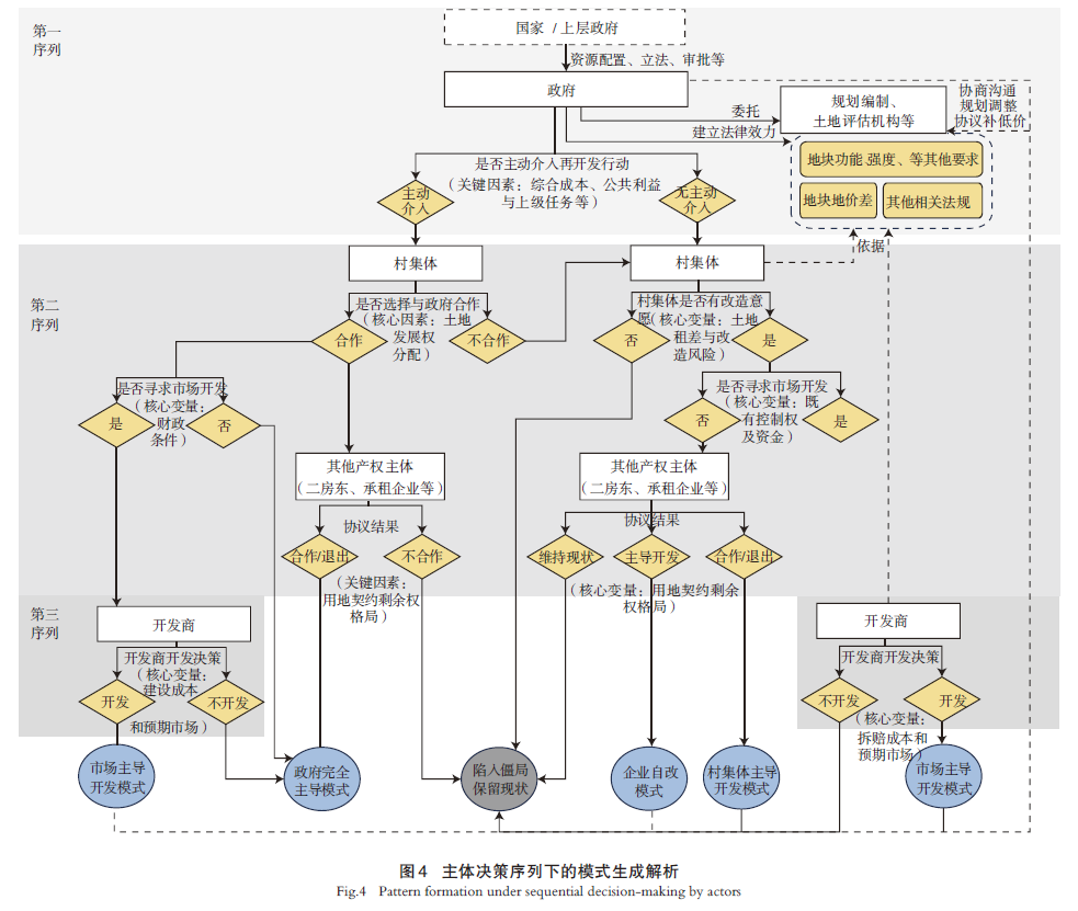 再开发主导者的比选过程受决策序列的约束(图4):第一序列为政府,其优先性体现在规划和政策中对产权、模式、资金等准入门槛的设置;第二序列为村集体和其他实际使用权人,村集体具有对集体土地国有化的决议权,但受与其他产权方签订的历史合约约束;第三序列为开发商。