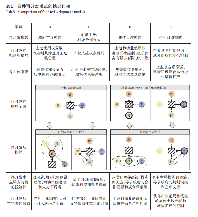 四个案例中,再开发前控制权格局分别呈现 “控制权均衡格局”(A、D)和“单主体强势格局”(B、C),前者再开发后格局为“某主体强势介入主导”,后者为“原强势主体主导”(表5)。