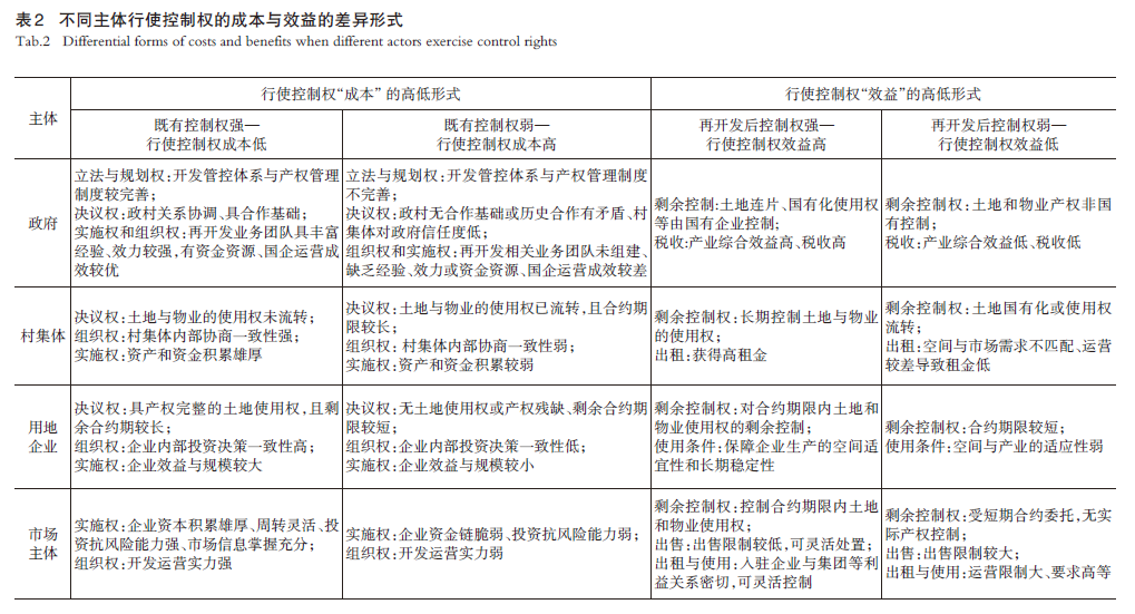 各主体捕获的租值取决于促成开发决议的成本(Cd),来源于“决议权、组织权和实施权”。凝练出“既有控制权强/弱—行使控制权成本高/低”及“再开发后控制权强/弱—行使控制权效益高/低” 的解释框架,各主体围绕行使控制权的“成本—效益”预期展开博弈(表2)。