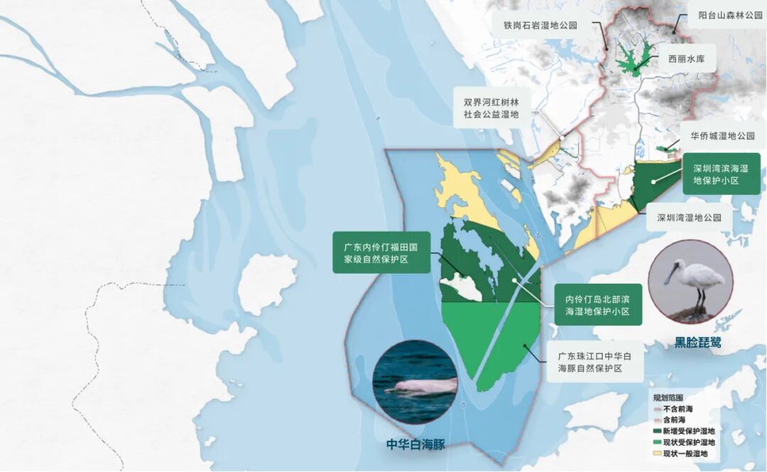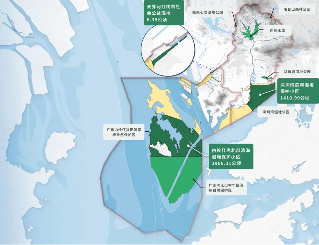 规划至2035年:受保护湿地面积≥106.67平方公里(不含前海为19.39平方公里),湿地保护率≥73.34%(不含前海为67.03%),新增受保护湿地包括深圳湾滨海湿地保护小区(1410.99公顷)、内伶仃岛北部滨海湿地保护小区(3906.31公顷)、双界河红树林社会公益湿地(6.38公顷)等3处。