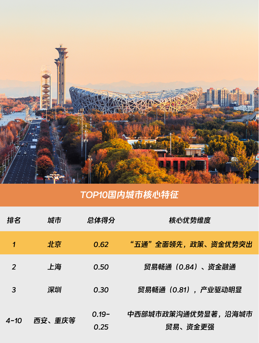 结果显示,北京作为首都,在“五通”领域均具备领先优势,以0.62的绝对优势位居第一;上海、深圳、广州、天津等东南沿海城市在前10位城市中占据较大比例;此外,西安、重庆、成都等中西部中心城市也排在前列。对比前10位城市的得分情况,东南沿海城市由于率先开放等历史背景,在贸易畅通、资金融通维度有更好的表现,中西部中心城市则在政策沟通上有相对更好的表现。