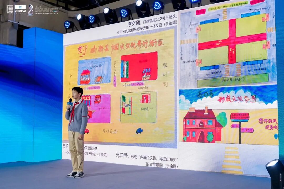 武汉市七一华源中学八年级(15)班的同学们在老师的带领和指导下,深入黄鹤楼和山海关地块调研,站在青少年的角度提出了彩色游道、诗词主题打卡框搭配VR技术等想法。最终,他们共同完成的环黄鹤楼观光片的方案获得了大众组“金点子”奖。学生代表丁同学在颁奖现场发言:“作为一名中学生,非常荣幸能有机会用设计‘金点子’去更新生活的城市。希望未来可以继续参加这样的活动,通过发现、创新,用新的方式做城市真正的主人翁。”七一华源中学也因积极组织并指导学生参赛而荣获本届大赛的“最佳组织奖”。