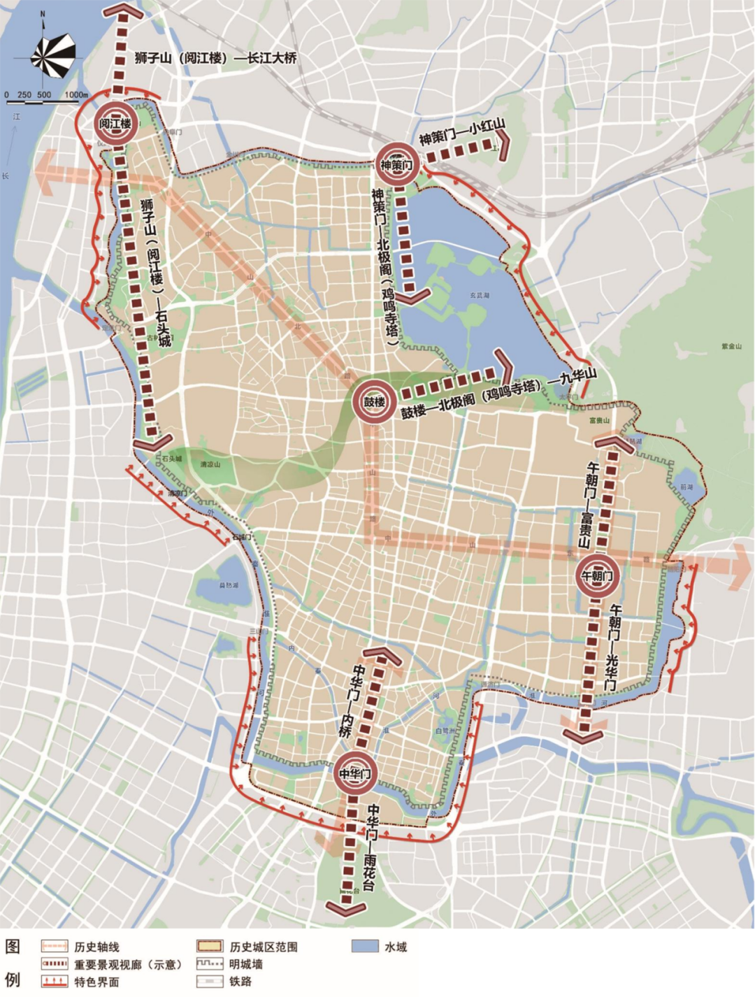 历史城区作为保护 “一核”,规划明确其范围以明京城城墙护城河(湖)对岸为界,包括明代京城及玄武湖范围,总面积约50 平方千米。针对历史城区,规划从多维度实施严格保护与管控: