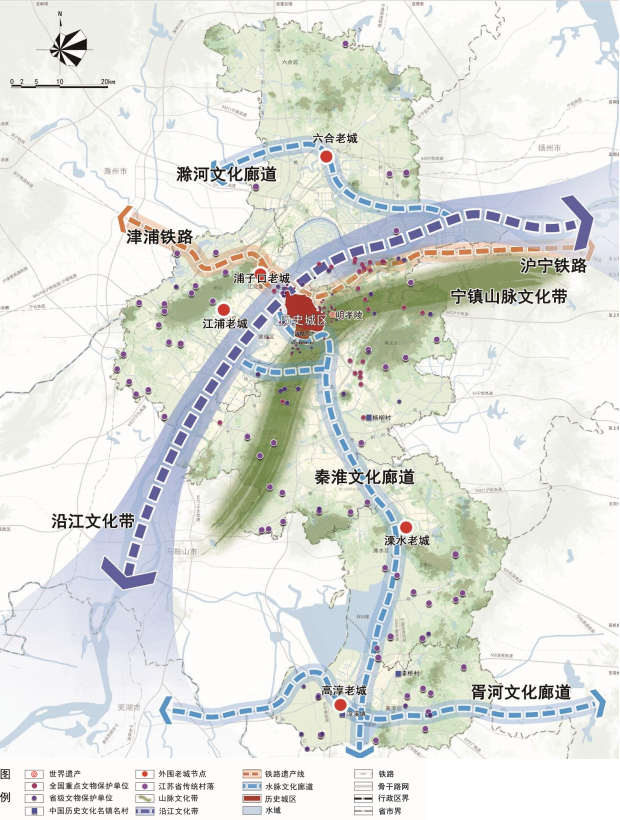 三河:包括秦淮河及其支流文化廊道、滁河文化廊道和胥河文化廊道,保护水系沿线的历史文化资源与自然生态景观。