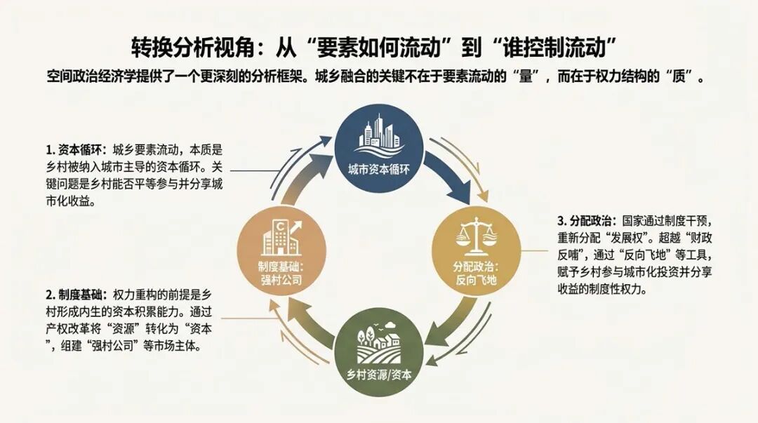 正是在这一意义上,城乡融合不再被理解为要素在城乡之间的简单流动,而被重新界定为一项围绕资本循环、空间结构与发展权展开的政治经济学过程。