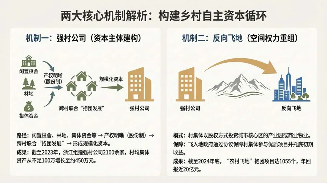 2. 资本和权力是一体两面的。城乡权力关系的重构首先取决于乡村是否具备内生性的资本积累能力。只有当乡村不再完全依赖外部资本注入,而能够将自身资源转化为可持续运作的资本形态时,城乡之间的谈判关系才可能发生实质性改变。近年来,各地通过村集体经济股份制改革,将土地、山林、水域等资源或闲置农房、厂房、校舍等资产加以资本化,并以“强村公司”“村级合作社”等组织形式推动集体资本的规模化与公司化运作。通过跨村联合与专业化经营,部分乡村逐步获得了参与更高层级投资活动的能力,这为松动城乡权力结构提供了制度基础。
