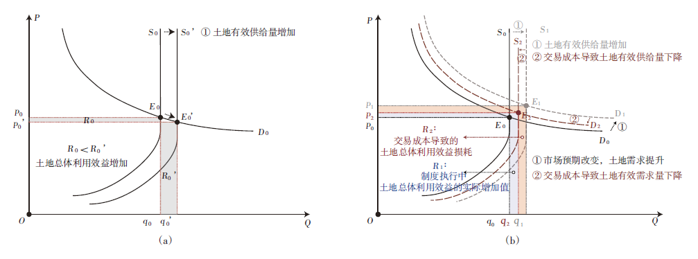 新制度经济学的研究指出了“看不见的手”是有先决条件的,只有在交易收益大于交易成本的前提下,市场机制才能有效配置资源。由于土地及其表面附属物具有很强的不可移动性,故而土地交易行为是有高昂代价且稀缺的,无法通过市场自发的无限试错以实现空间配置最优。只有当制度运行的总体成本不断得到压缩并小于权利转移后的效益增量时,才能接近土地开发效益最优的理想状态(图(1b))。