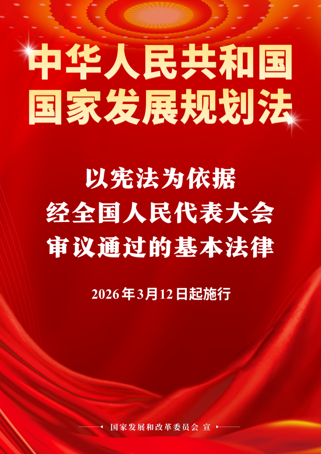 《中华人民共和国国家发展规划法》已由中华人民共和国第十四届全国人民代表大会第四次会议于2026年3月12日通过,现予公布,自公布之日起施行。
