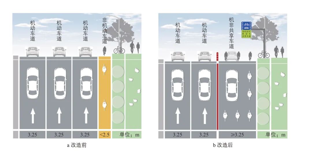 图4 机非共享车道改造前后道路断面示意