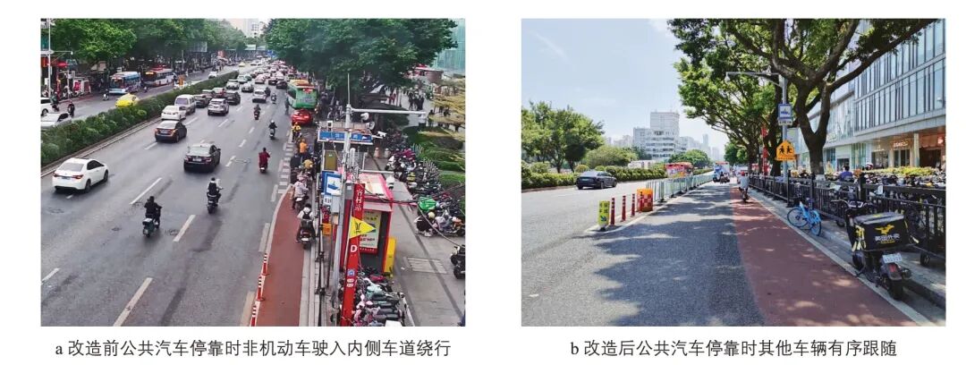 机非共享车道与相邻车行道通过物理隔离设施有效分隔,实现分道行驶,非机动车占用内侧机动车道通行、乱穿插的交通违法行为大幅减少,交通冲突隐患点大幅降低。同时,公共汽车、出租汽车、网约车在共享车道内即停即走,车辆违法占道停车行为得到有效抑制,而且机动车与非机动车均依次跟随通行,车速低于40 km·h-1,速度差缩小,有效缓解了追尾及侧向交通事故安全隐患(见图7)。改善前,该路段年均事故数5起、受伤3 人;机非共享车道实施后,尚未发生人员受伤事故,改善效果显著。