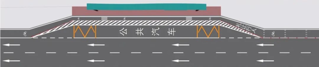 针对公共汽车站处非机动车道缺失、非机动车与进站公共汽车混行、非机动车影响公共汽车上落客等突出问题,在公共汽车站处设置连续的非机动车道,配套设置非机动车道路面标记、减速标线、“礼让行人”文字标识,并在公共汽车停车位与非机动车道中间预留宽度不小于1 m的公共汽车上落客安全缓冲区[5],降低公共汽车站处的机非、人非交通冲突,保障交通安全(见图3)。