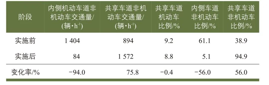 实施机非共享车道后,非机动车在共享车道内的行驶得到有效规范,减少了对其他机动车道的干扰,满足了大量非机动车的通行需求。同时,沿线机动车占道违法停车现象也得以减少,显著提升了该路段交通流的有序性、畅通性和安全性[9]。