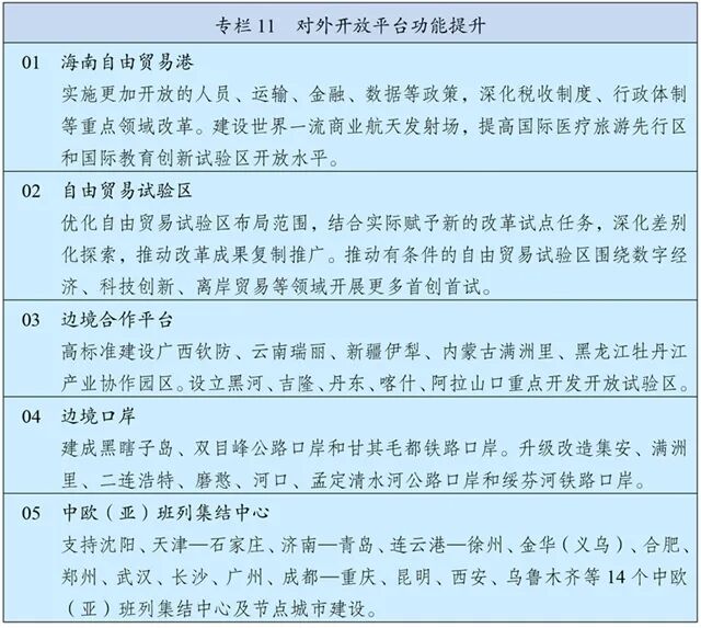 打造形态多样的开放高地,加快形成陆海内外联动、东西双向互济的全面开放格局。高标准建设海南自由贸易港,高水平实施全岛封关运作,持续提升贸易投资和要素流动等重点领域开放水平,逐步构建与高水平自由贸易港相适应的政策制度体系。实施自由贸易试验区提升战略,开展更大力度制度型开放试验,提升创新引领发展能级。统筹布局建设科技创新、服务贸易、产业发展等重大开放合作平台,支持功能相近、区位相邻的平台优化整合,推动国家级新区、开发区管理制度和运营模式创新,促进综合保税区转型升级,推进沿边重点开发开放试验区、产业协作园区、沿边临港产业园区和边(跨)境经济合作区等建设。