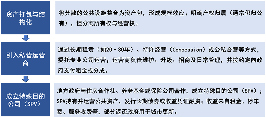 德国地方政府(市镇、州)将闲置或低效利用的公共不动产(如办公楼、学校旧址、市政车库、停车场、体育场馆、污水处理厂等)通过资产打包与结构化、引入私营运营商、成立特殊目的公司(SPV)等方式引入私营资本和专业管理。