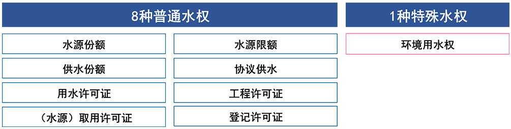 澳大利亚各地的水权类型及其名称并不统一。常见的水权类型有8+1种,即8种普通水权,1种特殊的环境用水权。